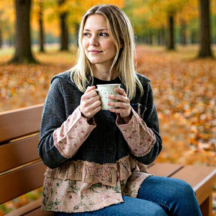 Discover timeless charm with this gray cardigan sweater, thoughtfully upcycled from vintage textiles. Featuring a unique button front, the bottom is adorned with a delicate faded floral pattern, it blends classic style with eco-friendly craftsmanship. Soft, cozy, and truly one-of-a-kind, this sweater adds subtle elegance to any wardrobe while supporting sustainable fashion.