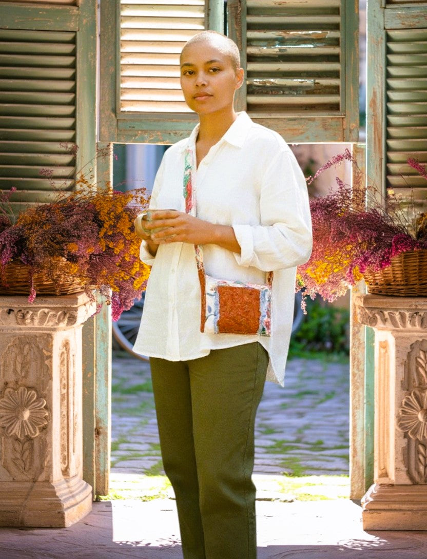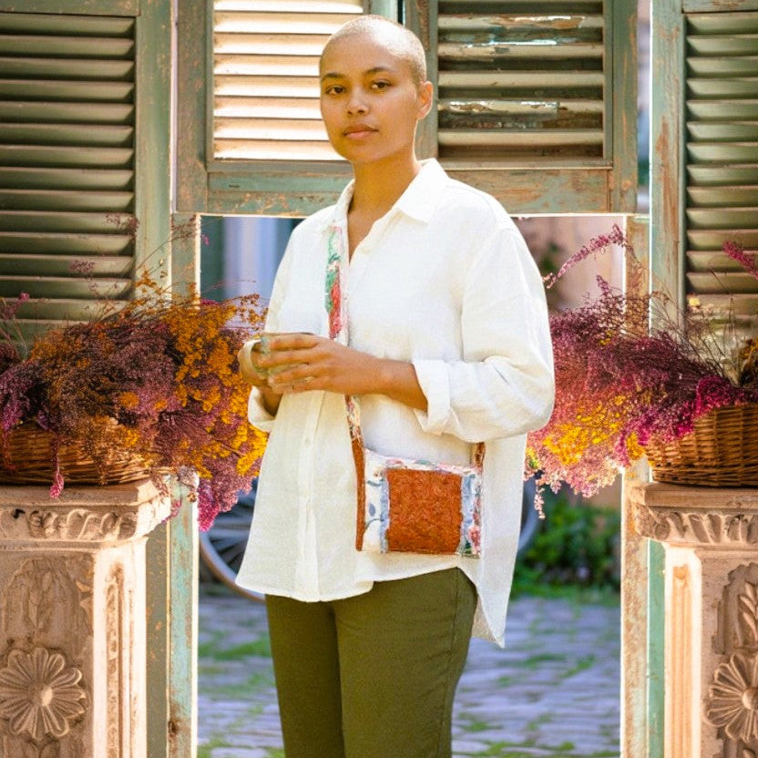 This charming mini crossbody bag combines style and practicality, perfectly sized at approximately 9"x9" to carry just your essentials. Featuring three separate compartments, it keeps your belongings neatly organized. Handcrafted from upcycled fabrics in warm rust and tan tones accented with floral patterns in soothing blues and greens, this patchwork design is both eco-friendly and uniquely beautiful. The long strap ensures comfortable, hands-free carrying wherever you go. Elevate your everyday look with a bag that's as thoughtful as it is adorable.