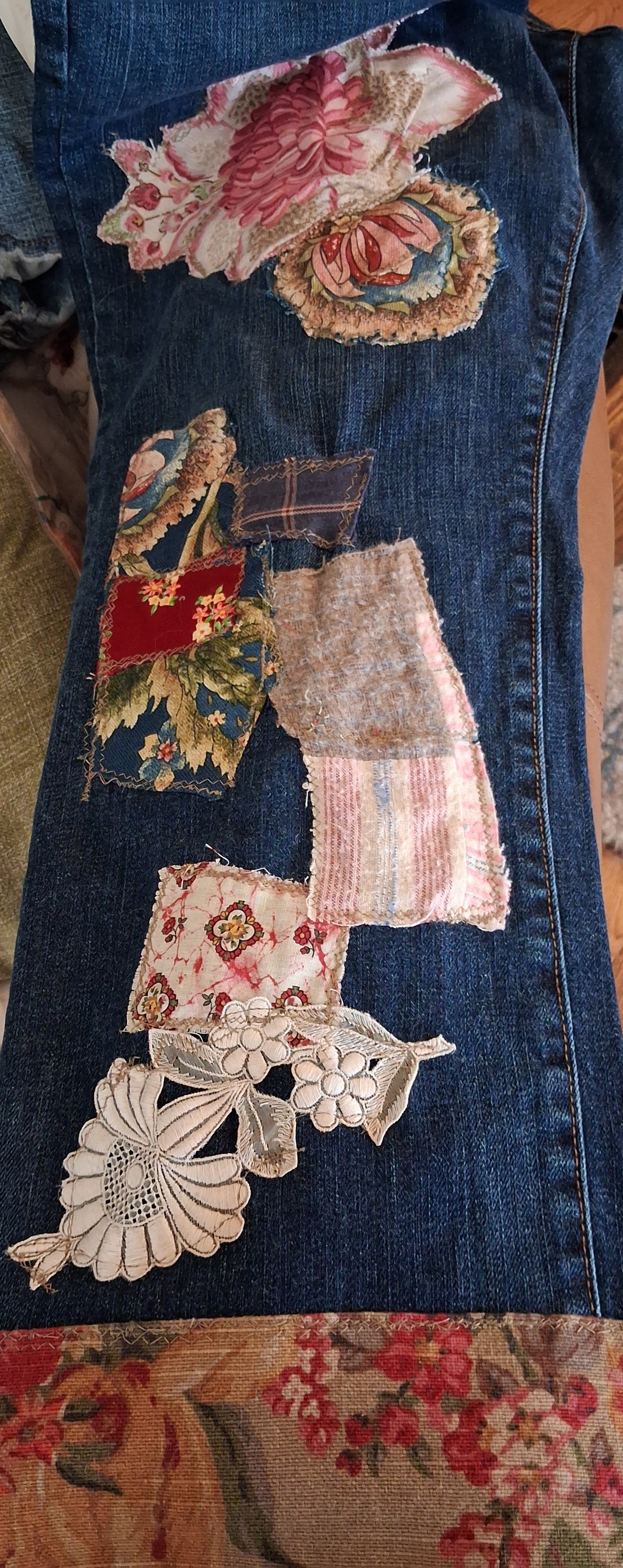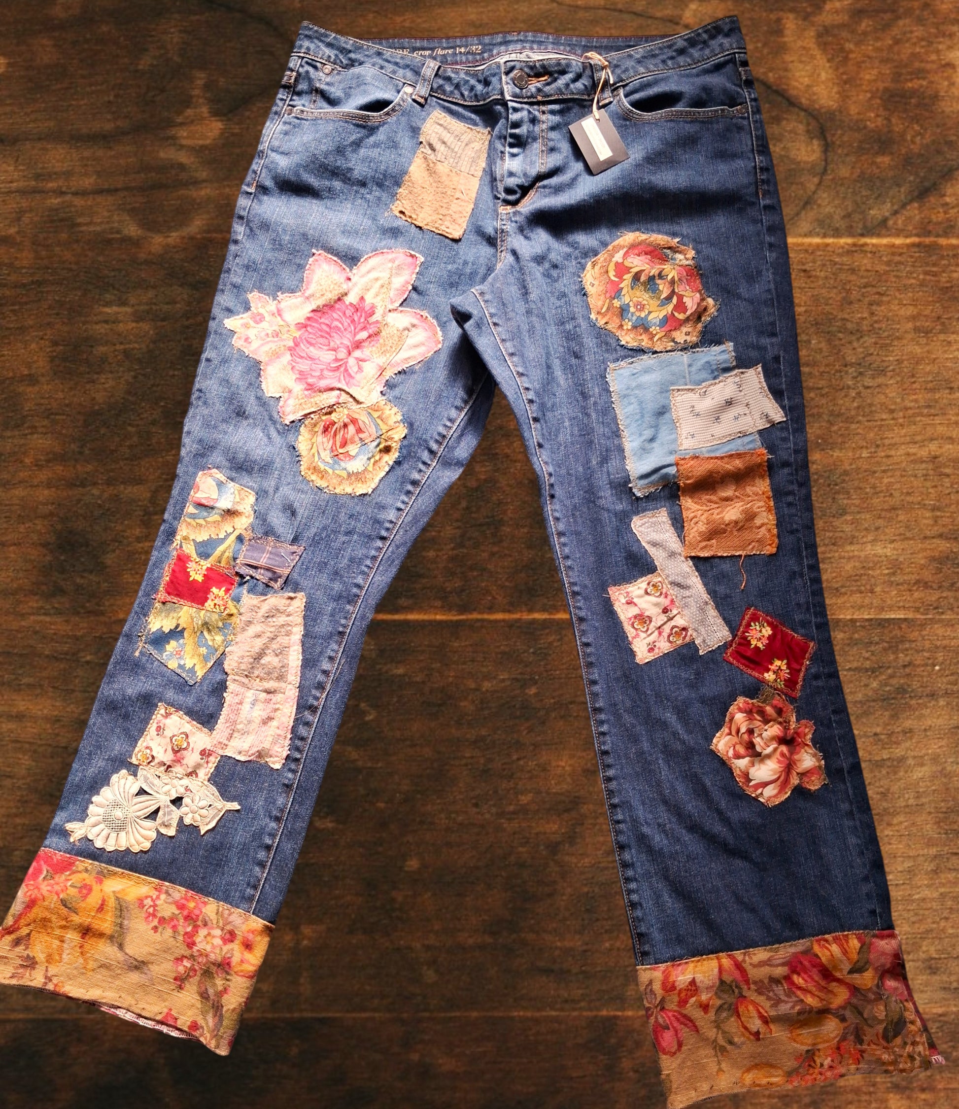 Discover the unique charm of our Upcycled Patchwork Jeans, crafted from a vibrant mix of vintage fabrics and trims. Each pair is hand appliqued, making every item truly one of a kind. Part of our sustainable Autumn Patchwork collection, these jeans blend eco-conscious fashion with bold, colorful style that stands out while reducing waste. Elevate your wardrobe with a statement piece that reflects creativity and commitment to the planet.