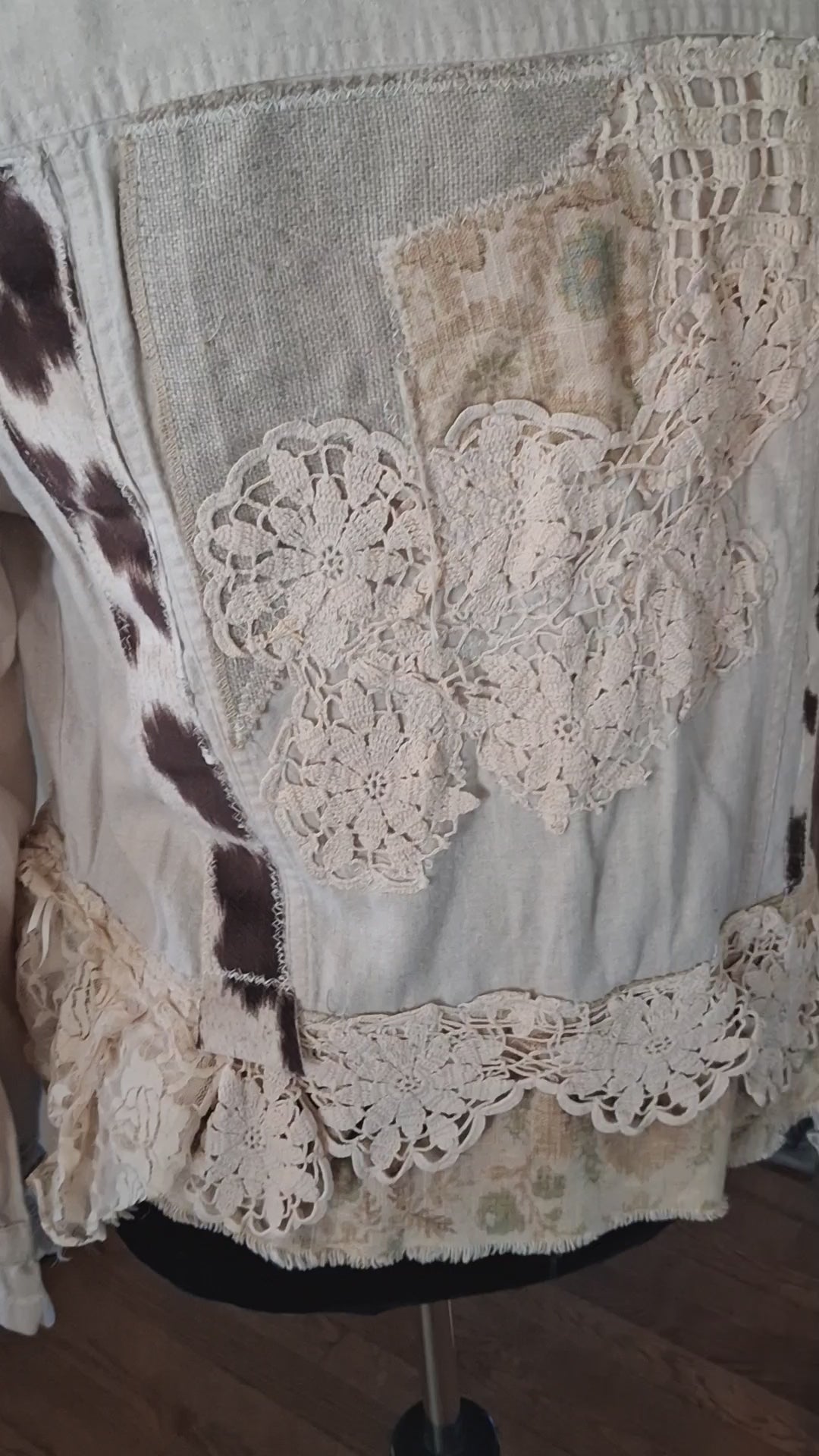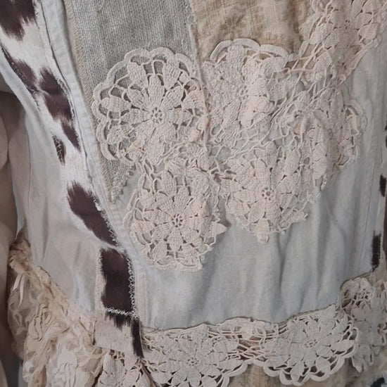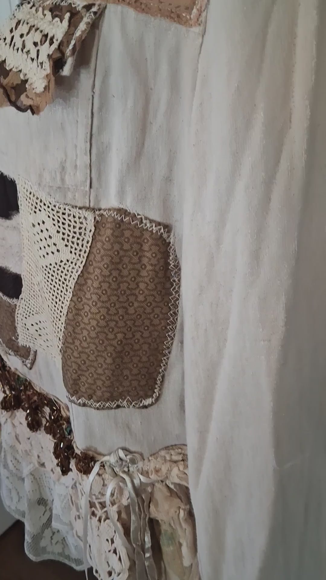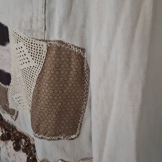 Discover the charm of sustainable style with this upcycled cream linen jacket, detailed with stunning beading and an eclectic mix of vintage lace trims. Crafted from gorgeous textiles in unique patchwork, this one-of-a-kind piece is wearable art. Pair it with this season’s rich browns and tans to make a bold, eco-conscious fashion statement while embracing repurposed clothing that stands out.