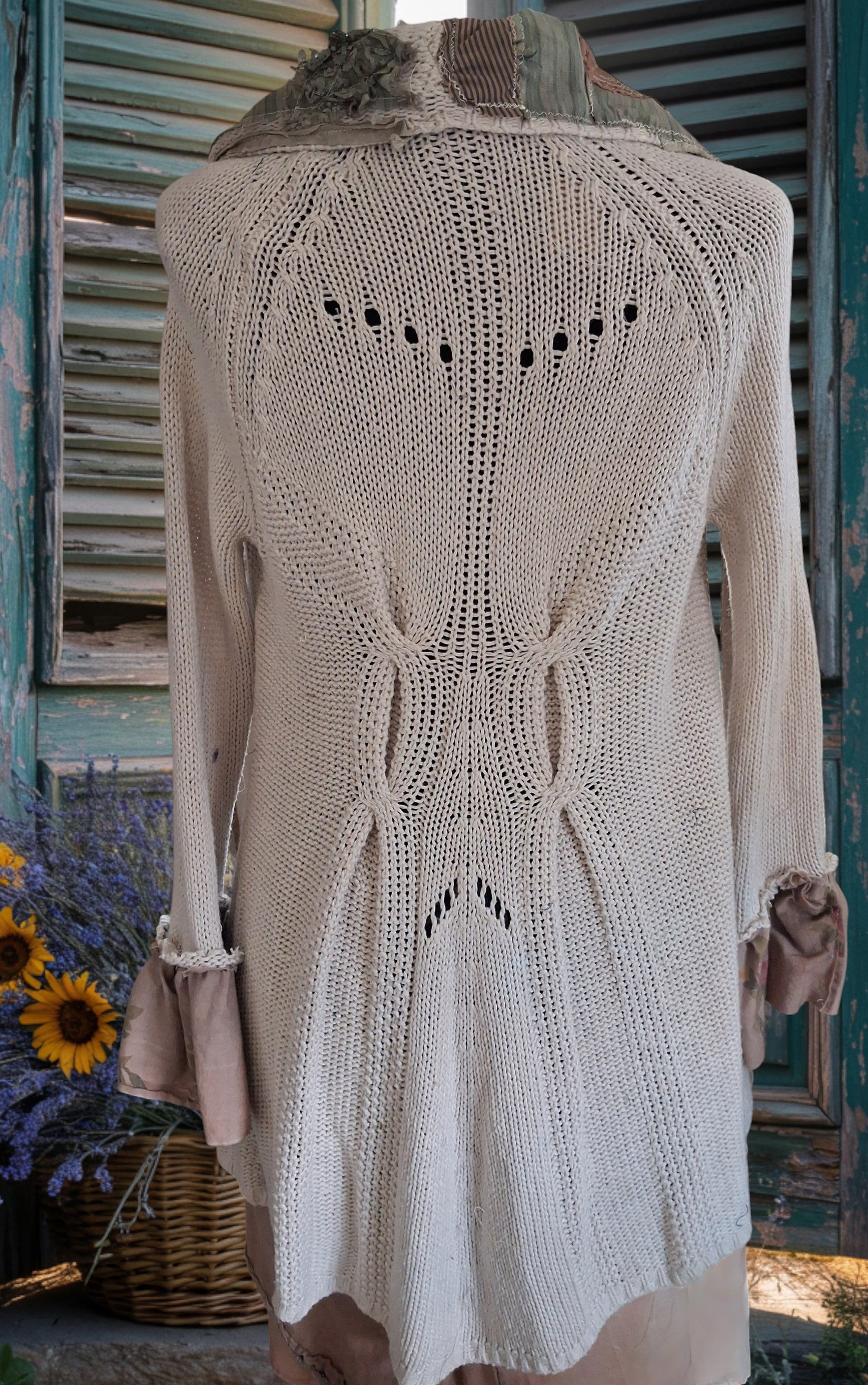 Elevate your wardrobe with the Creamy Patch Cardigan Sweater, a thoughtfully redesigned piece crafted from upcycled fabrics. Featuring unique denim and textile patches, bell fabric sleeves, this one-of-a-kind cardigan embraces circular fashion while offering a comfortable, tie-front fit that suits most sizes. Make a statement with sustainable style that’s as individual as you are.